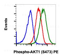 Fig-1: Flow cytometric analysis of Jurkat cells treated with LY294002 and unstained (blue) as negative control or treated with LY294002 (red) or with FBS (green) and stained using Phospho-Akt (Ser473) antibody AktS473-C7 PE conjugate.