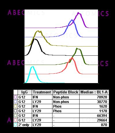 Fig-1: Peptide blocking flow cytometric analysis of K562 cells secondary antibody only negative control (light blue) or treated with LY294002 (red) or with IFNa + IL-4 + pervanadate (green) or LY294002 and blocked with phospho-peptide (black) or IFN+IL4+Pv and blocked with phospho peptide (gold) or LY294002 and blocked with non-phospho peptide (dark blue) or IFN+IL4+Pv and blocked with non-phospho peptide (purple) using Phospho-Akt1 (Thr308) antibody AktT308-G12 at 0.5 µg/mL.