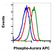 Fig-1: Flow cytometric analysis of HeLa cells untreated and unstained as negative control (blue) or untreated red) or treated with nocodazole (green) and stained using Phospho-Aurora A (Thr288)/Aurora B (Thr232)/Aurora C (Thr198) antibody AuroraABC-CC12 APC conjugate.