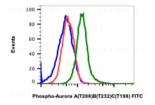 Fig-1: Flow cytometric analysis of HeLa cells untreated and unstained as negative control (blue) or untreated (red) or treated with nocodazole (green) and stained using Phospho-Aurora A (Thr288)/Aurora B (Thr232)/Aurora C (Thr198) antibody FITC conjugate, AuroraABC-CC12.