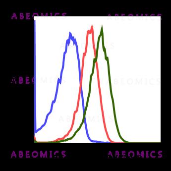Fig-1: Flow cytometric analysis of U937 cells secondary antibody only negative control (blue) or untreated (red) or treated with Calyculin A (green) using Phospho-BAD (Ser112) antibody BADS112-B9 at 0.01µg/mL.