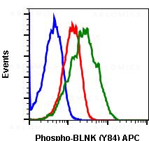 Fig-1: Flow cytometric analysis of Daudi cells unstained untreated cells as negative control (blue) or stained untreated (red) or treated with IFNa + IL-4 + pervanadate (green) using Phospho-BLNK (Tyr84) antibody BLNKY84-H4 APC conjugate.