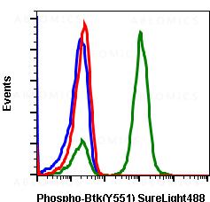 Fig-1: Flow cytometric analysis of Ramos cells unstained and untreated as negative control (blue) or stained untreated (red) or treated with pervanadate (green) using Phospho-Btk (Tyr551) antibody BtkY551-G12 SureLight488 conjugate.