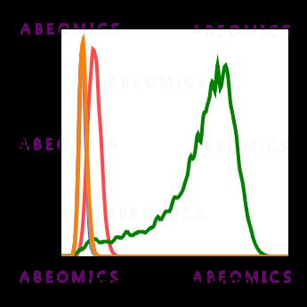 Fig-1: Flow cytometric analysis of C6 cells secondary antibody only negative control (blue) or treated with imatinib (grey) or with pervanadate (orange) using 0.1 µg/mL isotype control or imatinib (red) or pervanadate (green) using Phospho-c-Cbl (Tyr700) antibody CblY700-E1 at 0.1 µg/mL.