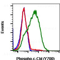 Fig-1: Flow cytometric analysis of C6 cells cell only only negative control (blue) or treated with imatinib (red) or with pervanadate (green) using Phospho-c-Cbl (Tyr700) SureLight 488-conjugated antibody CblY700-E1.