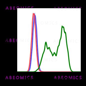 Fig-1: Flow cytometric analysis of Daudi cells secondary antibody only negative control (blue) or untreated (red) or treated with IFNa + IL-4 + pervanadate (green) using Phospho-c-Cbl (Tyr774) antibody CblY774-R3B8 at 0.01 µg/mL.