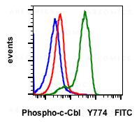 Fig-1: Flow cytometric analysis of Daudi cells untreated as negative control (blue) or untreated (red) or treated with IFNa + IL-4 + pervanadate (green) and stained using Phospho-c-Cbl (Tyr774) FITC-conjugated antibody CblY774-R3B8.