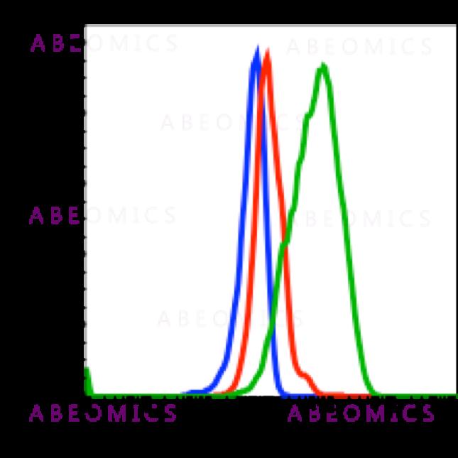 Fig-1: Flow cytometric analysis of Hela cells secondary antibody only negative control (blue) or treated imatinib (red) or treated with pervanadate (green) using Phospho-Chk1 (S317) antibody Chk1S317-F10 0.1 µg/mL.