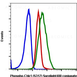 Fig-1: Flow cytometric analysis of Hela cells secondary antibody only negative control (blue) or treated with (red) or treated with pervanadate (green) using phospho-Chk1 (S317) antibody Chk1S317-G1 Surelight488 conjugate.