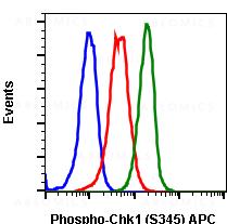Fig-1: Flow cytometric analysis of HeLa cells secondary antibody only negative control (blue) or untreated (red) or treated with UV plus TPA (green) using Phospho-Chk1(S345) APC-conjugated antibody Chk1S345-R3F9.