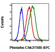Fig-1: Flow cytometric analysis of HeLa cells, unstained and untreated as negative control (blue) or stained and untreated (red) or stained and treated with UV plus TPA (green) using Phospho-Chk2 (Thr68) antibody CHK2T68-D12 APC conjugate.