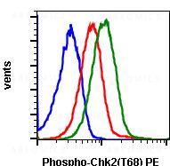Fig-1: Flow cytometric analysis of HeLa cells, unstained and untreated cells as negative control (blue) or stained and untreated (red) or stained and treated with UV plus TPA (green) using Phospho-Chk2 (Thr68) antibody CHK2T68-D12 PE conjugate.