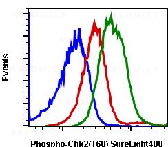 Fig-1: Flow cytometric analysis of HeLa cells, Unstained and untreated cells as negative control (blue) or stained and untreated (red) or stained and treated with UV plus TPA (green) using Phospho-Chk2 (Thr68) antibody CHK2T68-D12 SureLight 488 conjugate.