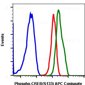 The cyclic AMP-responsive element (CRE)-binding protein (CREB) is a 43-kDa leucine zipper transcription factor that belongs to the CREB/ATF family and modulates the activity of many eukaryotic transcription factors by altering their subcellular localization, DNA binding, or transactivation response. It regulate downstream targets involving in various cellular functions including cell proliferation, survival, and differentiation (1-2). CREB activity is considered critical for neuronal function and regulates synaptic plasticity, long-term memory formation and neuronal survival (3). CREB serine 133 (Ser-133) residue is phosphorylated by various kinases and this phosphorylation promotes the interaction of CREB with a number of transcription coactivators, especially the histone acetyltransferases CREB-binding protein (CBP) or p300 (4,5). CREB can be phosphorylated and thus activated in response to various stimuli such as growth factors, neurotransmitters, stress signals that increase intracellular cAMP or calcium levels. CREB is also activated by phosphorylation at Ser-133 through nuclear translocation of transducer of regulated CREB activity (TORC) coactivators (6,7). CREB is phosphorylated in response to hormonal stimuli that increase intracellular cAMP production, but it can also be phosphorylated in response to a wide variety of extra-cellular signals, including growth factors, osmotic stress and ultraviolet irradiation. Several kinases including ribosomal protein S6 kinase (pp90RSK), protein kinase C (PKC), protein kinase B/AKT, and mitogen- and stress-activated protein kinase (MSK-1) can phosphorylate CREB at Ser-133 (1,8). Different growth factors such as mast/stem cell growth factor, basic fibroblast growth factor, and Granulocyte-macrophage colony-stimulating factor (GM-CSF), can all induce phosphorylation of CREB (9, 10). Phospho CREB, upon activation, dimerizes and binds to the promoter regions of its target gene that contains cAMP response element (CRE site), TGACGTCA, or CRE half sites CGTCA/TGACG, and promotes the recruitment of its transcriptional coactivators, CBP/p300, for CREB-mediated transcription. Therefore, phospho CREB can regulate various cellular mechanisms through modulating its target genes. CREB is progressively dephosphorylated by the Ser/Thr phosphatases protein phosphatase 1 (PP1) and PP2A.