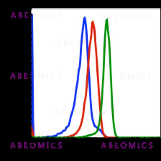 Fig-1: Flow cytometric analysis of K562 cells secondary antibody only negative control (blue) or imatinib (red) or treated with pervanadate (green) using Phospho-CrkL (Tyr207) antibody CrkLY207-G4 at 0.05 µg/mL.
