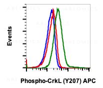 Fig-1: Flow cytometric analysis of K562 cells treated with imatinib and unstained (blue) as negative control or treated with imatinib (red) or treated with pervanadate (green) and stained using Phospho-CrkL (Tyr207) APC conjugated antibody CrkLY207-G4.