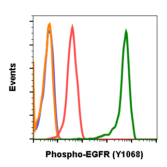Fig-1: Flow cytometric analysis of K562 cells secondary antibody only negative control (blue) or untreated (red) or treated with EGF and pervanadate (green) using Phospho-EGFR (Tyr1068) antibody at 0.01 µg/mL EGFRY1068-E5.