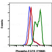 Fig-1: Flow cytometric analysis of K562 cells unstained cells negative control (blue) or stained and untreated (red) or treated with EGF and pervanadate (green) using Phospho-EGFR (Tyr1068) APC antibody EGFRY1068-E5-APC. .