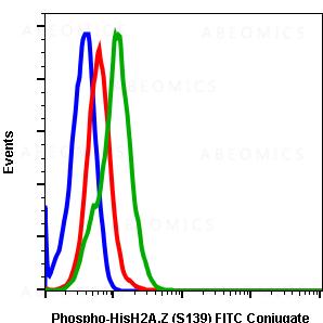 Fig-1: Flow cytometric analysis of 293T cells unstained cells (blue) or stained untreated (red) or treated with UV and TPA (green) using Phospho-Histone H2A.X (Ser139) antibody HisH2AXS139-1B3 FITC-conjugated.