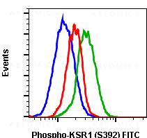 Fig-1: Flow cytometric analysis of HeLa human adenocarcinoma cells untreated and unstained as negative control (blue) or treated with lambda phosphatase and stained (red) or untreated and stained (green) using Phospho-KSR1(S392) antibody, KSR1S392-3A4 FITC conjugate.