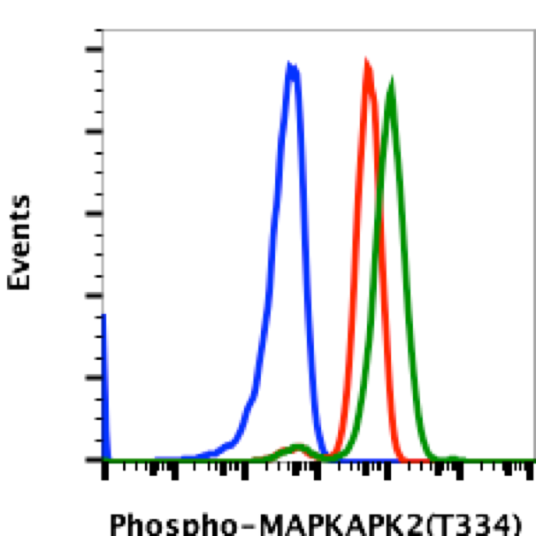 Fig-1: Flow cytometric analysis of U937 cells secondary antibody only negative control (blue) or untreated (red) or treated with CalA (green) using Phospho-MAPKAPK2 (T334) antibody MAPKAPK2T334-H2 0.1 µg/mL.