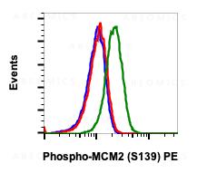 Fig-1: Flow cytometric analysis of C6 cells, untreated and unstained as negative control (blue) or untreated (red) or treated with staurosporine (green) and stained using Phospho-MCM2 (Ser139) antibody MCM2S139-B12 PE conjugate.
