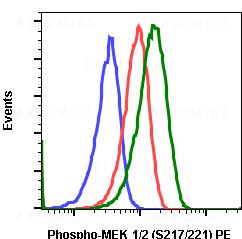 Fig-1: Flow cytometric analysis of Hela cells unstained treated with imatinib as negative control (blue) or stained treated with imatinib (red) or treated with pervanadate (green) using Phospho-MEK1/2 (S217/221) antibody MEK12S217S221-H2 PE conjugate.