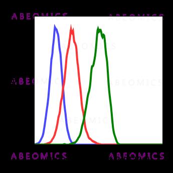 Fig-1: Flow cytometric analysis of HeLa cells secondary antibody only negative control (blue) or treated with imatinib (red) or with pervanadate (green) using Phospho-MEK1/2 (S221) antibody MEK12S221-D3 0.1 µg/mL.