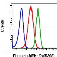 Fig-1: Flow cytometric analysis of Hela cells secondary antibody only negative control (blue) or treated with imatinib (red) or treated with pervanadate (green) using Phospho-MEK1 (S298) antibody MEK1S298-H8 0.5 µg/mL.