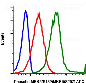 Fig-1: Flow cytometric analysis of HEK293T cells K252a treated cells as negative control (blue) or stained and treated with K252a (red) or treated with UV+TPA (green) using phospho-MKK3(Ser189)/MKK6(Ser207) antibody MKK3S189MKK6S207-D3 APC-conjugate.
