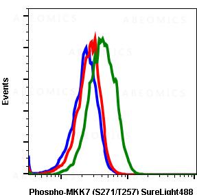 Fig-1: Flow Cytometry analysis of 293T cells unstained untreated as negative control (blue) or stained and untreated (red) or stained and treated with UV plus TPA using phospho-MKK7 (Ser271/Thr275) antibody MKK7S271/T275-R4F9 SureLight488.