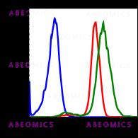 Fig-1: Flow cytometric analysis of U937 cells secondary antibody only negative control (blue) or untreated (red) or treated with CalA (green) using Phospho-MSK1(T581) antibody MSK1T581-A5 1.0 µg/mL.