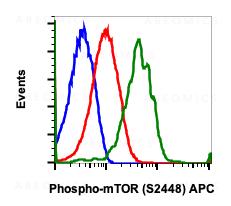 Fig-1: Flow cytometric analysis of A431 cells treated with phosphatase and unstained as negative control (blue) or treated with phosphatase (red) or EGF (green) and stained using Phospho-mTOR (Ser2448) APC conjugated antibody mTORS2448-E11.