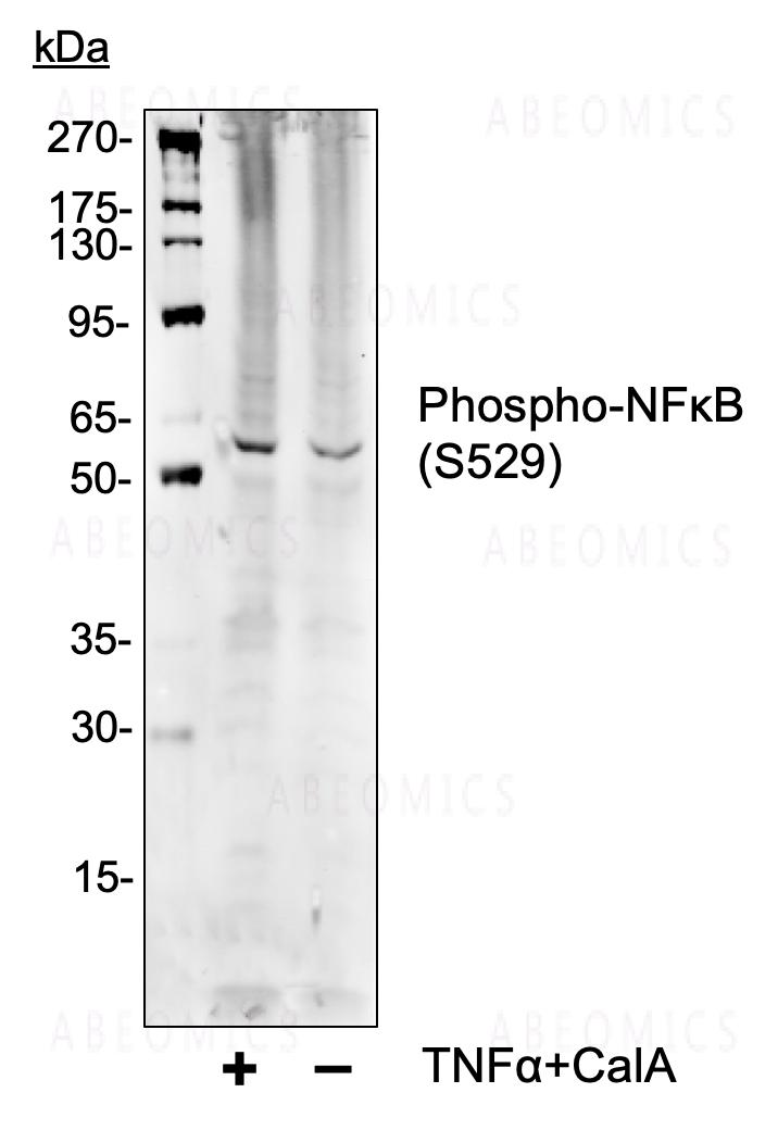 Fig-1: Western blot analysis of NIH3T3 cell extract untreated or treated with TNFa and calyculin A using Phospho-NFkB p65 (Ser529) antibody NFkBS529-A2 at 0.05 µg/mL.
