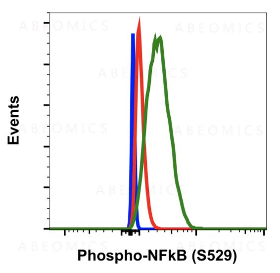 Fig-1: Flow cytometric analysis of HeLa cells secondary antibody only negative control (blue) or untreated (red) or treated with TNFa + calyculin A (green) using Phospho-NFkB p65 (Ser529) antibody NFkBp65S529-H3 at 0.01µg/mL.