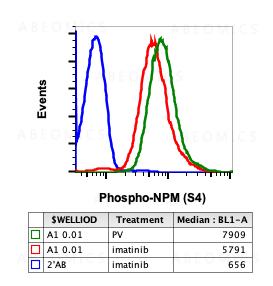 Fig-1: Flow cytometric analysis of K562 cells secondary antibody only as negative control (blue) or treated with imatinib (red) or treated with pervanadate (green) using Phospho-NPM (Ser4) at 0.01 µg/mL.