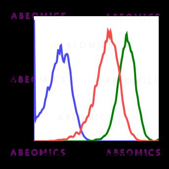 Fig-1: Flow cytometric analysis of C6 cells secondary antibody only negative control (blue) or untreated (red) or treated with staurosporine (green) using phospho-p38 MAPK (Thr180/Tyr182) antibody P38T180Y182-E3 0.01 µg/mL.