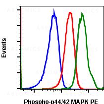 Fig-1: Flow cytometric analysis of Jurkat cells, treated with U0126 and unstained as negative control (blue) or treated with U0126 and stained (red) or treated with TPA and stained (green) using Phospho-p44/42 MAPK (ERK1/2) (Thr202/Tyr204) antibody, ERK1/2T202/Y204-A11 PE conjugate.