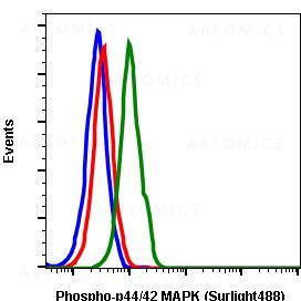 Fig-1: Flow cytometric analysis of Jurkat cells secondary antibody only negative control (blue) or treated with U0126 (red) or treated with TPA (green) using Phospho-ERK1/2 (Thr202/Tyr204) antibody ERK12T202Y204-A11 SureLight488.
