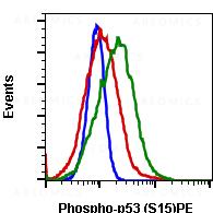 Fig-1: Flow cytometric analysis of Hela cells unstained imatinib treated cells (blue) or stained treated with imatinib (red) or treated with pervanadate (green) using phospho-p53 (Ser15) antibody P53S15-1C11 PE conjugate.