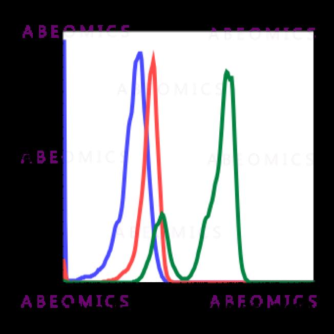 Fig-1: Flow cytometric analysis of Ramos cells secondary antibody only negative control (blue) or untreated (red) or treated with pervanadate (green) using Phospho-PI3 Kinase p85 (Tyr458)/p55 (Tyr199) antibody PI3KY458-1A11.