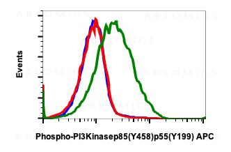 Fig-1: Flow cytometric analysis of Ramos cells untreated and unstained as negative control (blue) or untreated (red) or treated with pervanadate (green) and stained using Phospho-PI3 Kinase p85 (Tyr458)/p55 (Tyr199) antibody PI3KY458-1A11 APC conjugate.