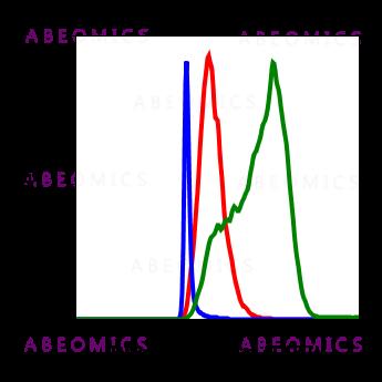 Fig-1: Flow cytometric analysis of K562 cells secondary antibody only negative control (blue) or untreated (red) or treated with EGF + pervanadate (green) using PKCa (T497) antibody PKCaT497-F1 at 0.1 µg/mL.
