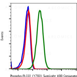 Fig-1: Flow cytometric analysis of Hela cells unstained imatinib treated cells (blue) or stained treated with imatinib (red) or with pervanadate (green) using phospho-PLCg1 (Tyr783) antibody using PLCg1Y783-C4 SureLight488 conjugate.