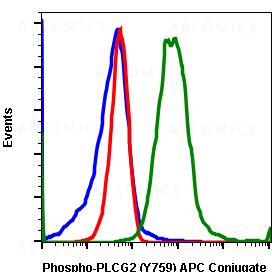 Fig-1: Flow cytometric analysis of Hela cells unstained imatinib treated cells (blue) or stained and treated with imatinib (red) or treated with pervanadate (green) using Phospho-PLCg2 (Tyr759) antibody PLCG2Y759-G3 APC conjugate.