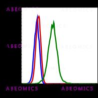 Fig-1: Flow cytometric analysis of Hela cells unstained cells negative control (blue) or stained and treated with imatinib (red) or treated with pervanadate (green) using Phospho-PLCg2 (Tyr759) FITC conjugate antibody PLCG2Y759-G3.