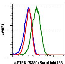 Fig-1: Flow cytometric analysis of A431 cells, untreated and unstained as negative control (blue) or untreated and stained (green) or treated with lambda phosphatase and stained (red) using Phospho-PTEN (S380) antibody, PTENS380-NA9 SureLight488 conjugate.