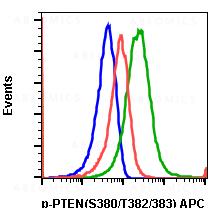 Fig-1: Flow cytometric analysis of A431 cells, unstained and untreated cells as negative control (blue) or stained untreated (green) or stained and treated with lambda phosphatase (red) using Phospho-PTEN (Ser380/Thr382/383) antibody PTENS380T382383-E4 APC conjugate.