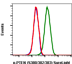 Fig-1: Flow cytometric analysis of A431 cells, unstained and untreated as negative control (blue) or stained and untreated (green) or stained and treated with lambda phosphatase (red) using Phospho-PTEN (Ser380/Thr382/383) antibody PTENS380T382383-E4 SureLight488 conjugate.