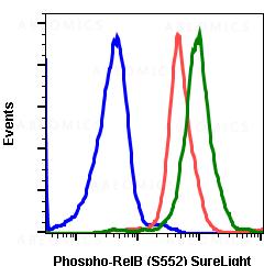 Fig-1: Flow cytometric analysis of Daudi secondary antibody only negative control (blue) or untreated (red) or treated with TPA (green) using Phospho-RelB (Ser552) SureLight488-conjugated antibody RelBS552-A7.